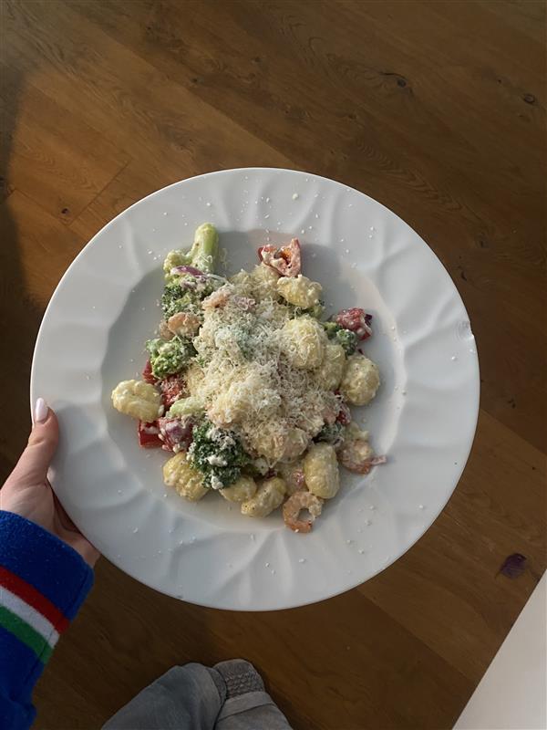 Gnocchi (logischerweise), Feta, Shrimps, Broccoli, Zucchini, Paprika, Tomaten und Spinat